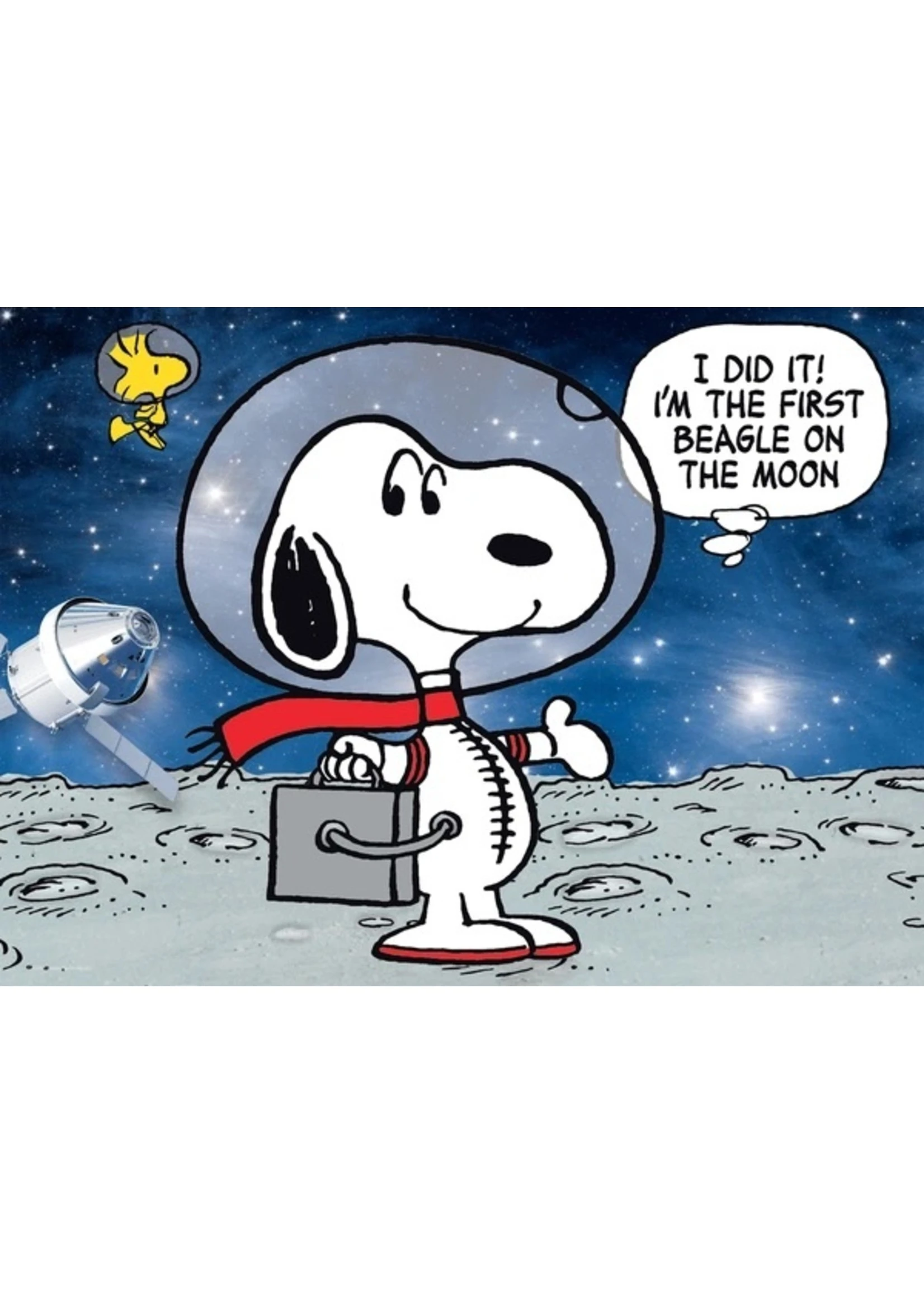 This colorful 100 piece puzzle features Snoopy from the Peanuts cartoon as an astronaut on the moon. A bubble of words says, “I did it! I’m the first Beagle on the Moon.”