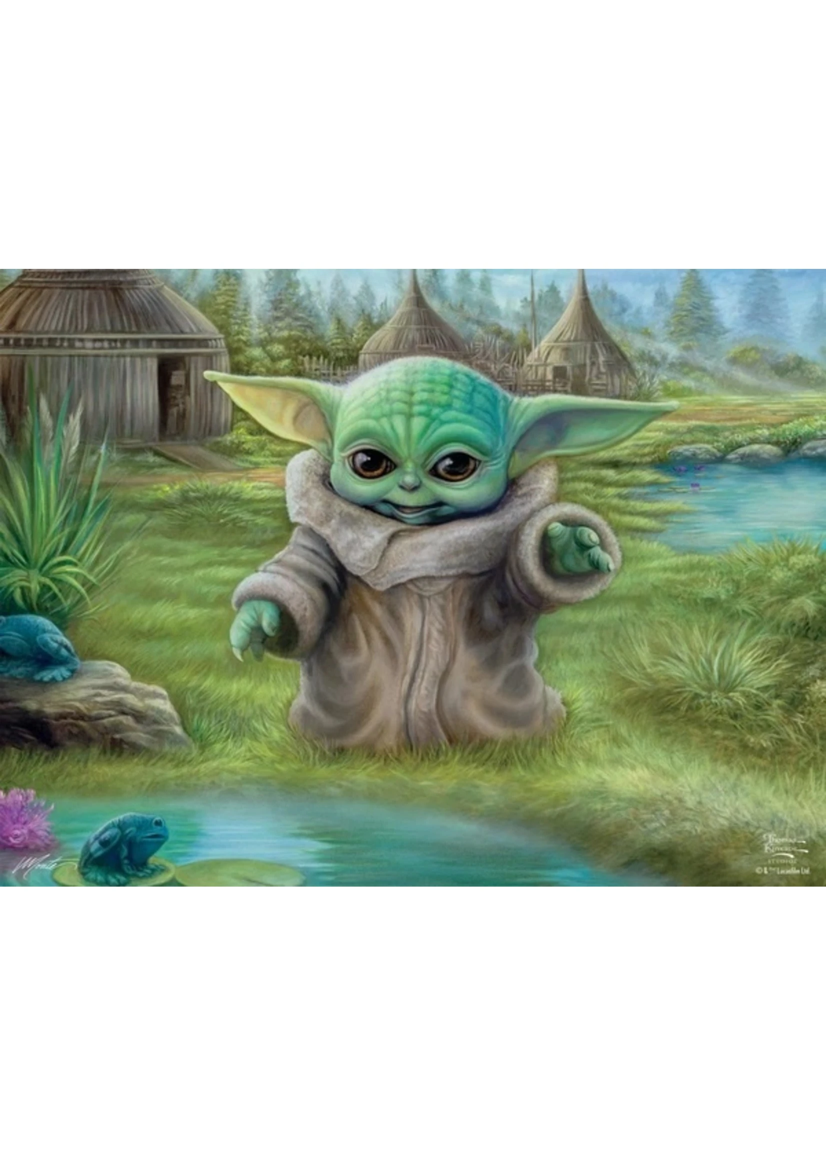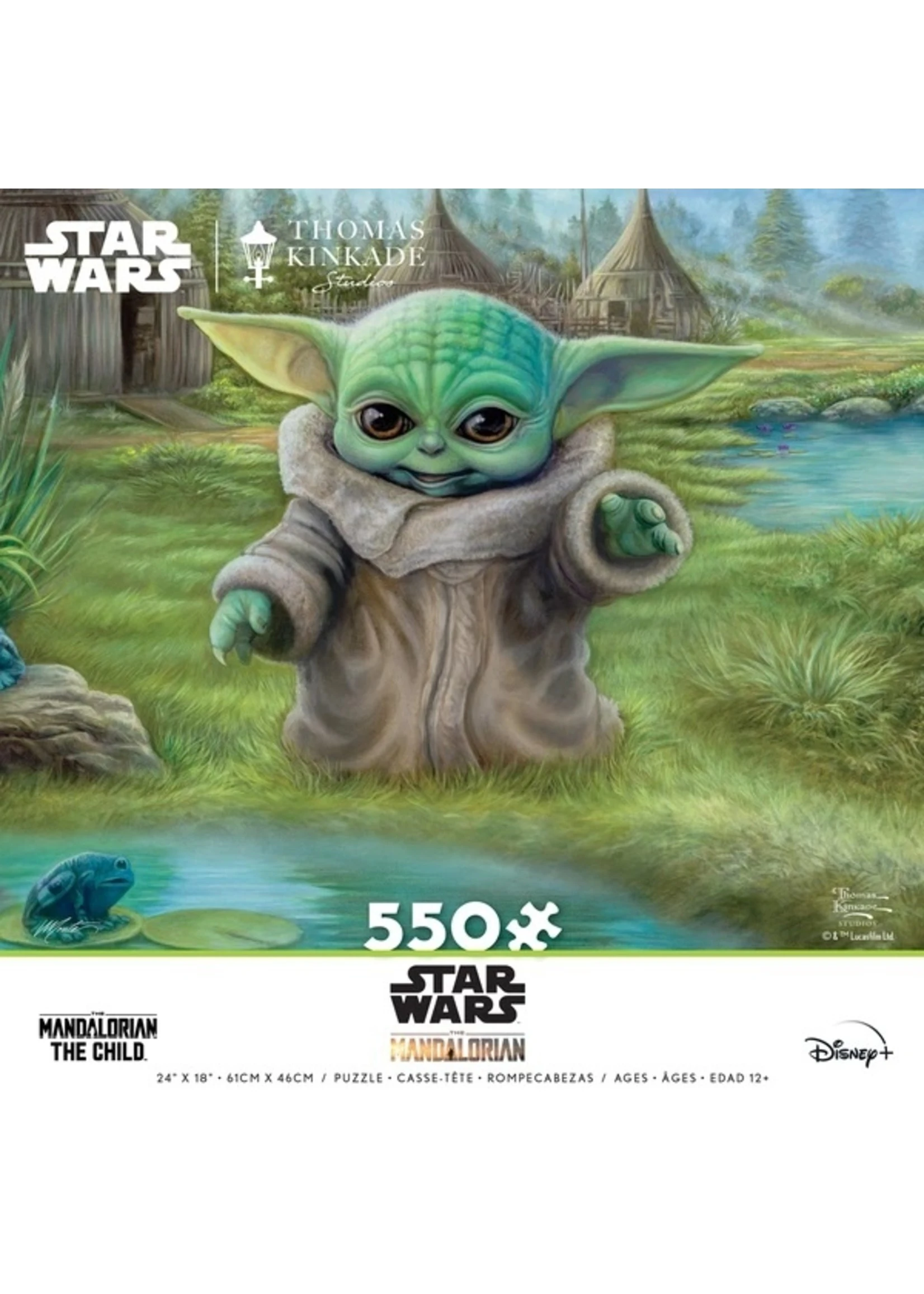 This Thomas Kinkade Star Wars 550 piece puzzle features a scene from the Mandalorianâ„¢ Baby Yoda takes a moment and plays by a pond.