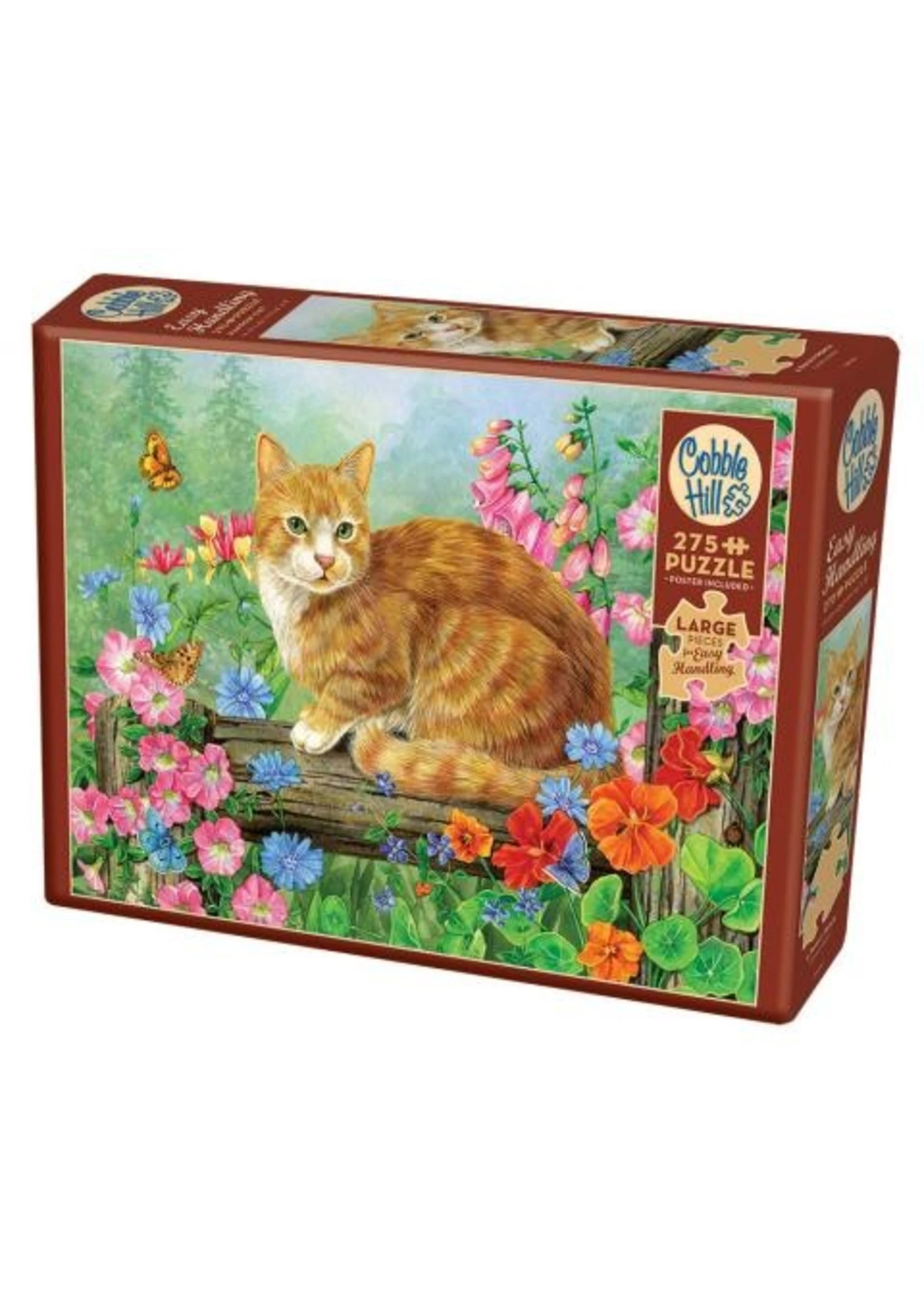 The little ginger cat has found her Perfect Perch on the wooden fence amongst the friendly butterflies and pretty flowers. A cheerful Easy Handling 275 piece puzzle with large pieces.