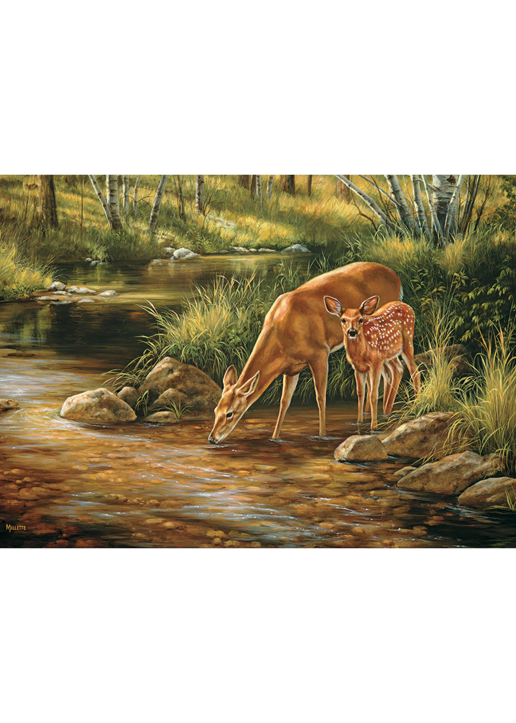 The Deer Family are getting fresh water at the stream, but little fawn hears something in the forest. A serene Family Pieces 350 puzzle.