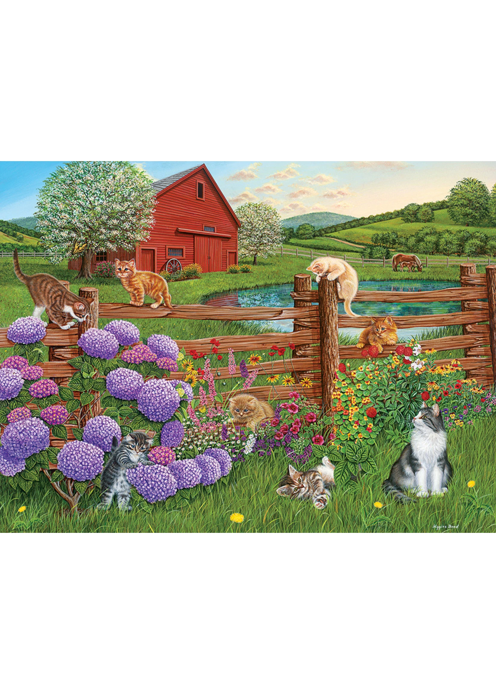 Farm Cats is an Easy Handling 275 piece puzzle featuring eight furry felines frolicking in the fresh flower field! An adorable farm scene for any puzzler or cat lover!