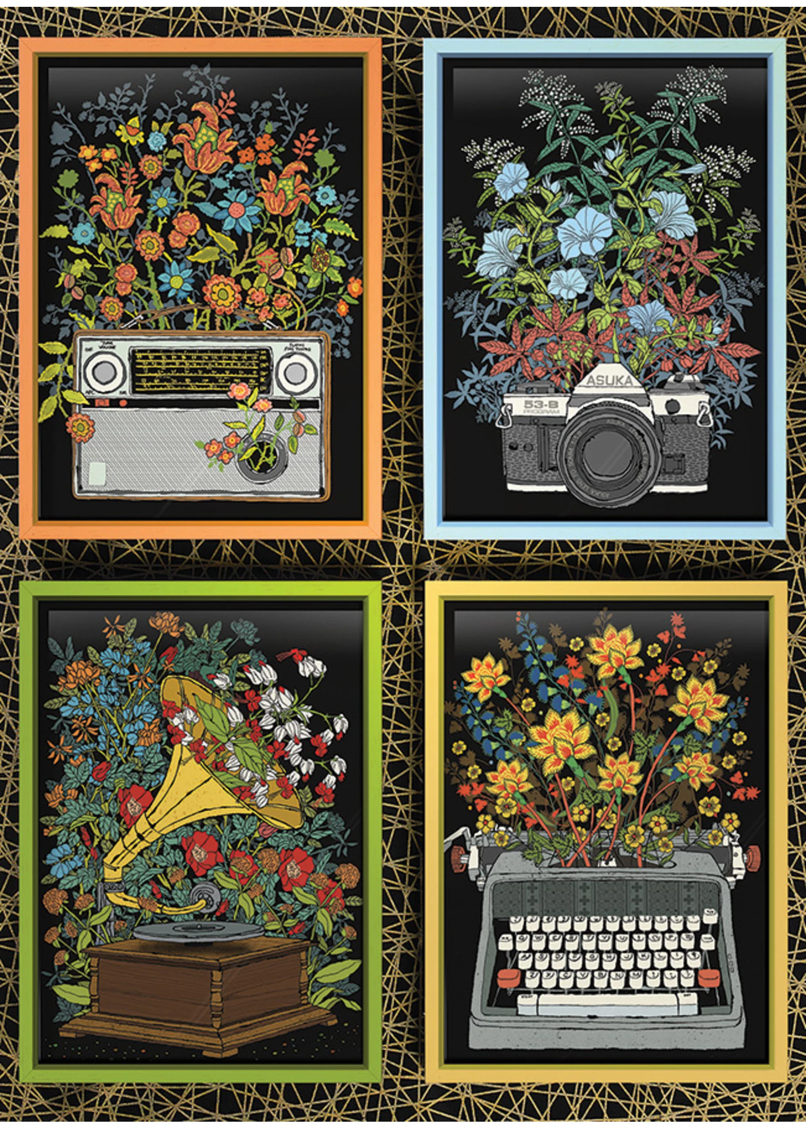 Vintage shadowboxes feature Floral Objects surrounding days of old machinery including a phonograph and classic typewriter. Take an adventure with Cobble Hill’s 1000 piece random cut puzzle that includes a reference poster.
