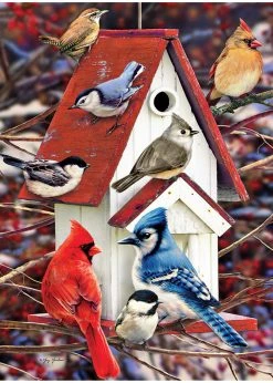 A patriotic collection of birds in their red, white, and blue perched upon their Winter Birdhouse. A 1000 piece birders delight.