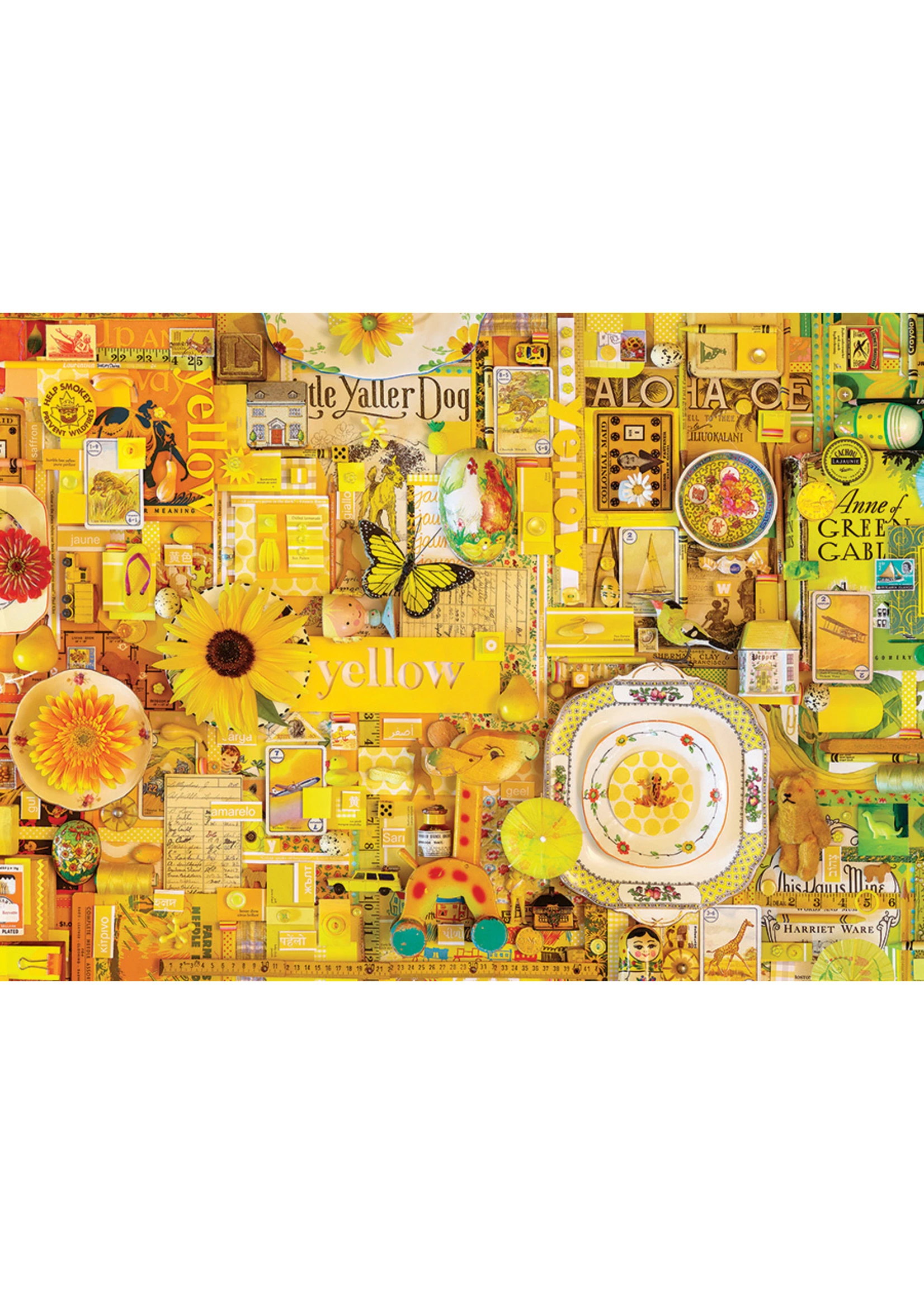 This special 1000 piece puzzle by artist Shelley Davies celebrates all things Yellow. It’s one in a series of seven puzzles that make up a rainbow theme when all are completed and aligned next to each other, spanning 15.5 feet. Ribbons of the word, “yellow” are spelled out in multiple languages, along with vintage knick knacks and a pencil with the artist’s name on it. Yellow will bring sunshine to a puzzler’s day! The Rainbow Collection is a unique puzzle designed and photographed exclusively for Cobble Hill in Victoria, BC.