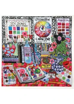 An afternoon in an artist’s studio… Color wheels on the wall, gouache tubes, watercolors, a glass jar with brushes drying, and a sketchbook full of inspirational pieces. All the materials are spread out on a fluorescent-pink-and-red-patterned cloth. Which medium will the artist use? What is the muse today? Painted by Sharon Nullmeyer and inspired by her own studio in Woodstock, New York.