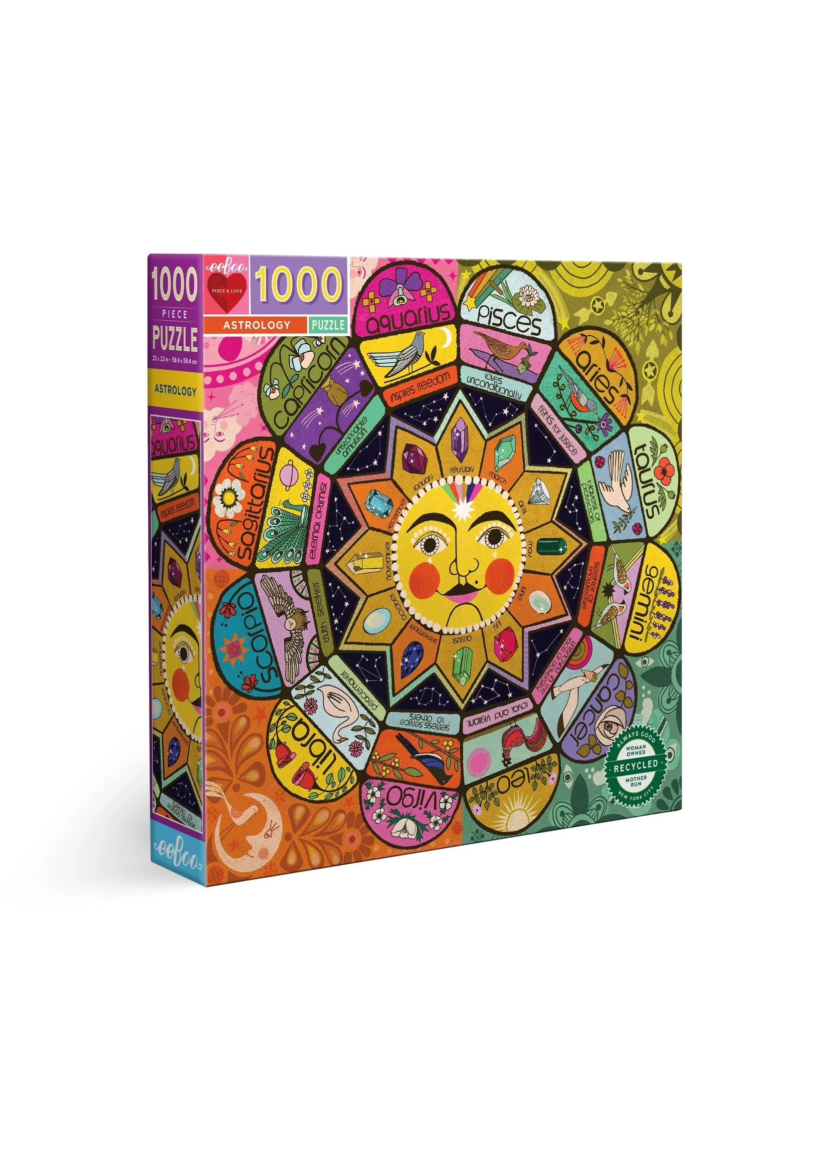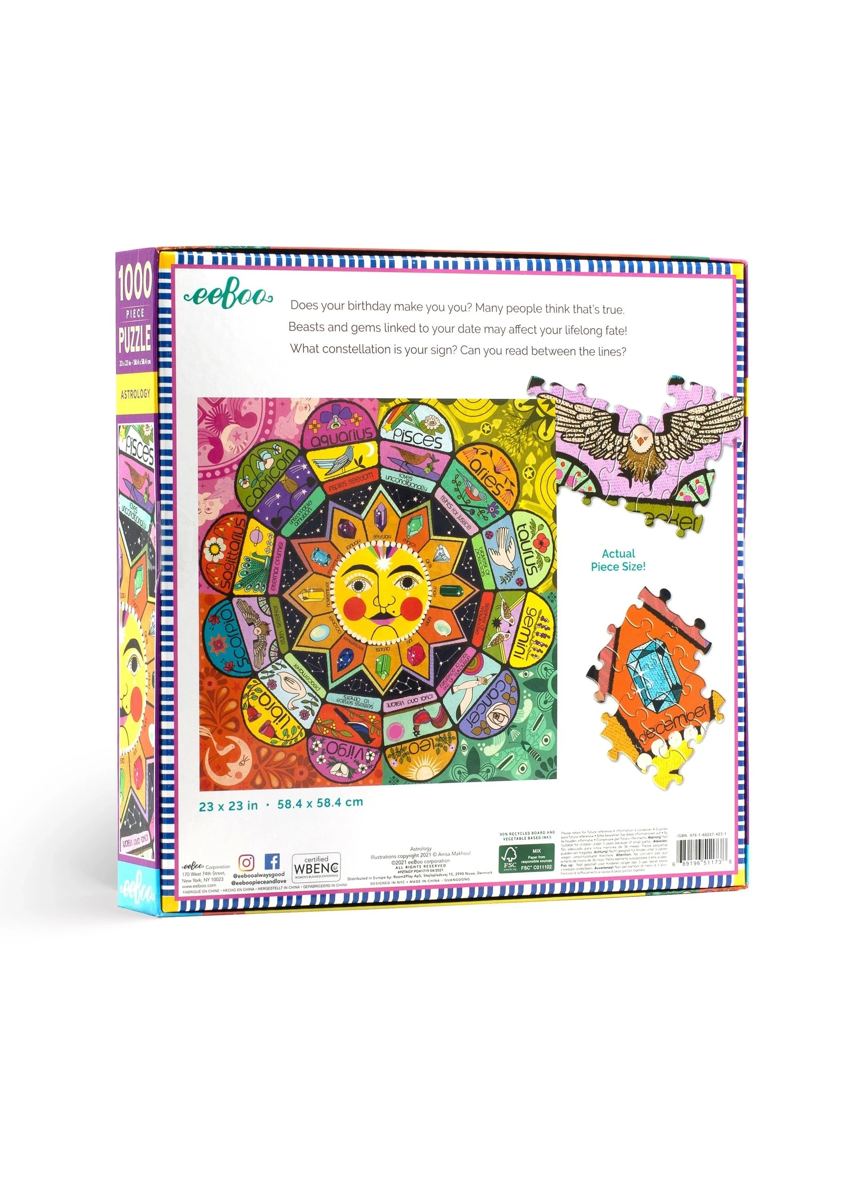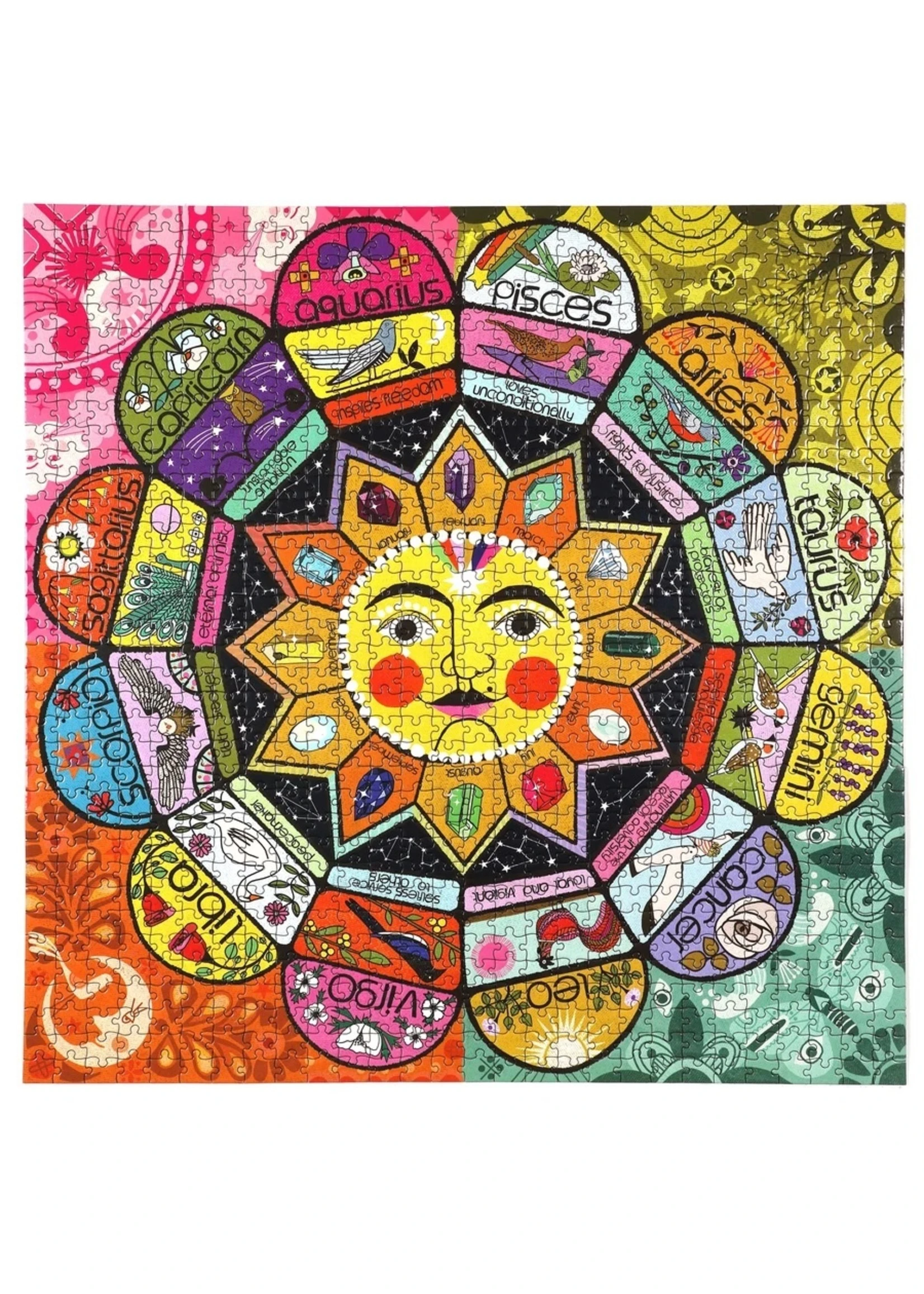 Surrounded by the four elements—earth, wind, fire, and air—this zodiac gives insight and assigns traits to the twelve astrology signs. Each zodiac sign represented shows its flower, bird, motto, constellation, and gem. This square horoscope reference puzzle is illustrated in vivid detail with rich colors by Anisa Makhoul.