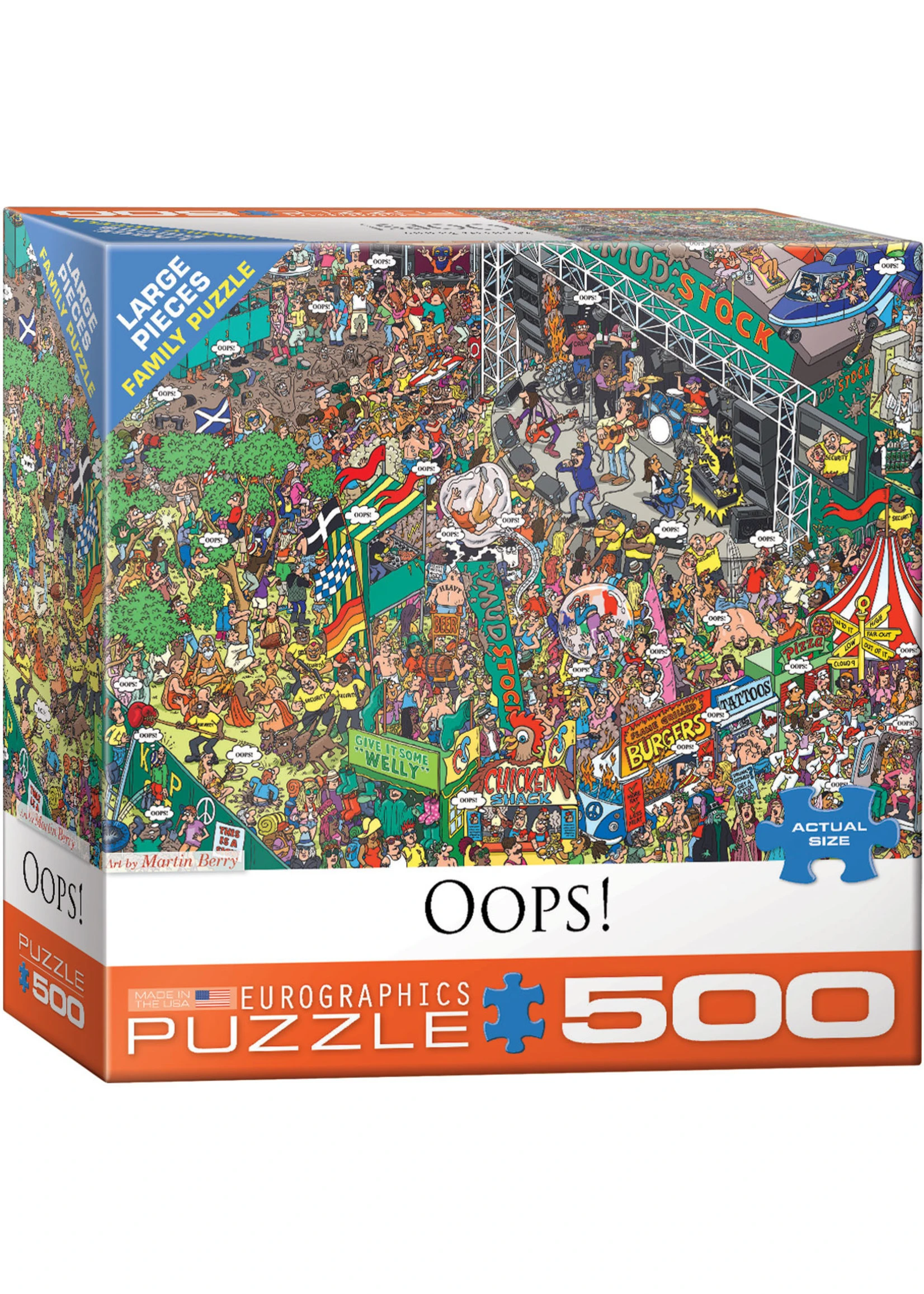 - Cartoon Art-Oops! By artist Martin Berry is a whimsical look at a festival scene with multiple incidents happening in park.