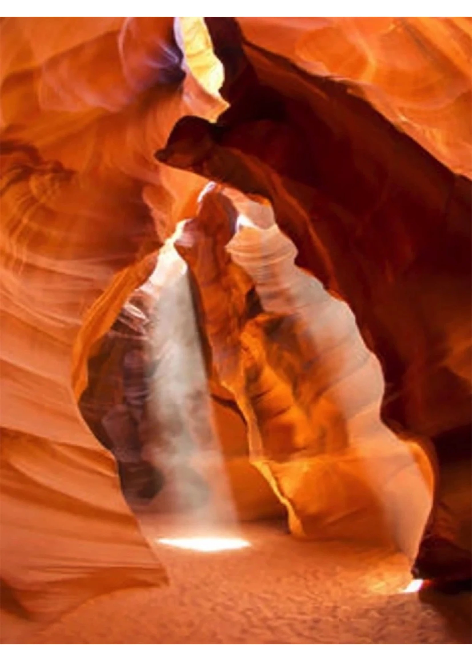 Carved into the reds and golds of northern Arizona sandstone, Antelope Canyon is among the world’s most photogenic natural landscapes. Formed by water rushing through rock, it’s a slot canyon – a narrow gash in the earth – its swirling ridged rock walls a canvas of extraordinary colors in subtle grades from muted purple to bright orange. When the sun is at its highest point, beams of light shoot down from above so brightly and powerfully they look tangible.