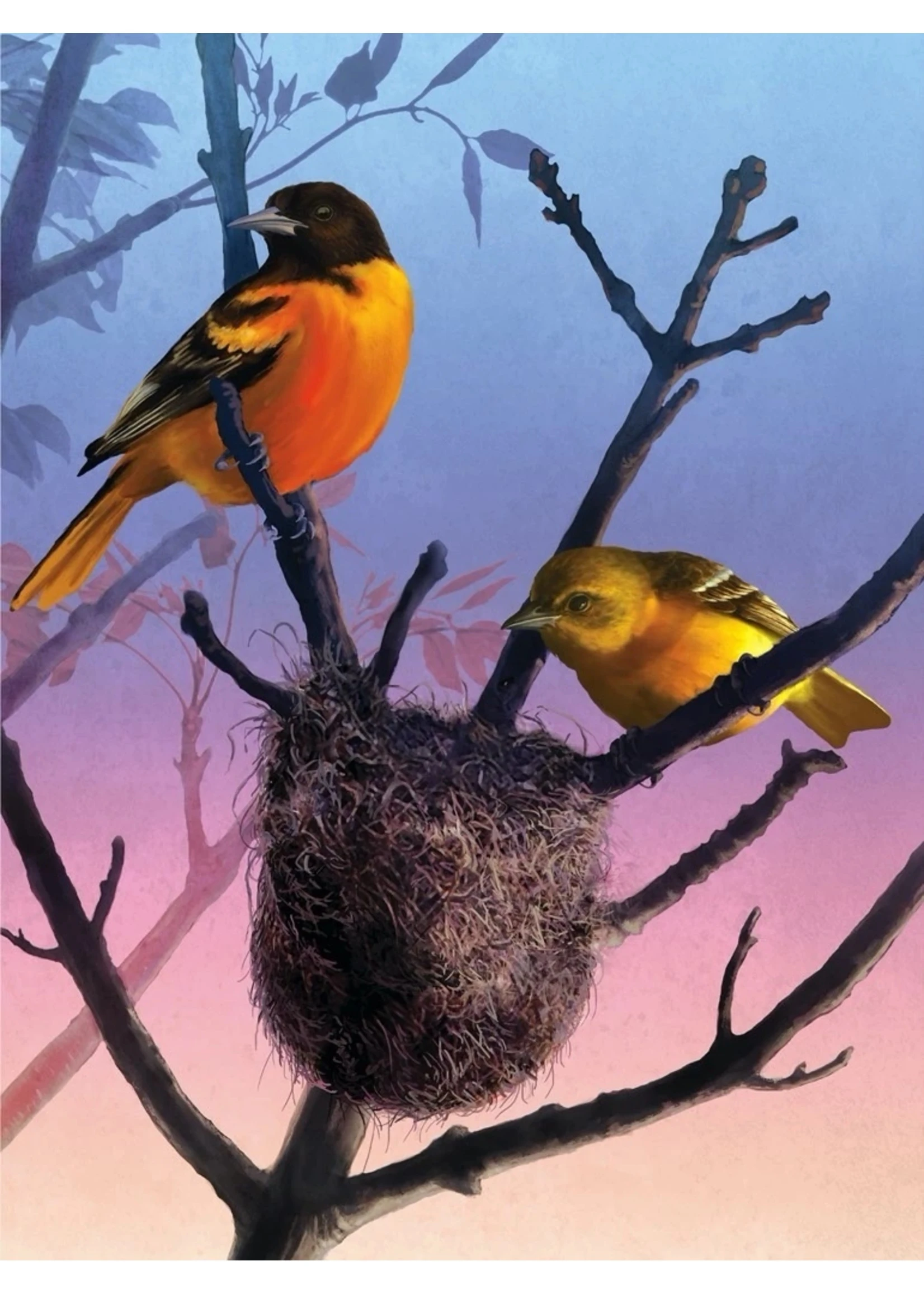The rich, whistling song of the Baltimore Oriole, echoing from treetops near homes and parks, is a sweet herald of spring. Look way up to find these singers: the male’s brilliant orange plumage blazes from high branches like a torch. Nearby, you might spot the female weaving her remarkable hanging nest from slender fibers. Fond of fruit and nectar as well as insects, Baltimore Orioles are easily lured to backyard feeders with cut oranges or a bowl of grape jelly. In late summer, they fly back to Central and South America where they spend the winter.