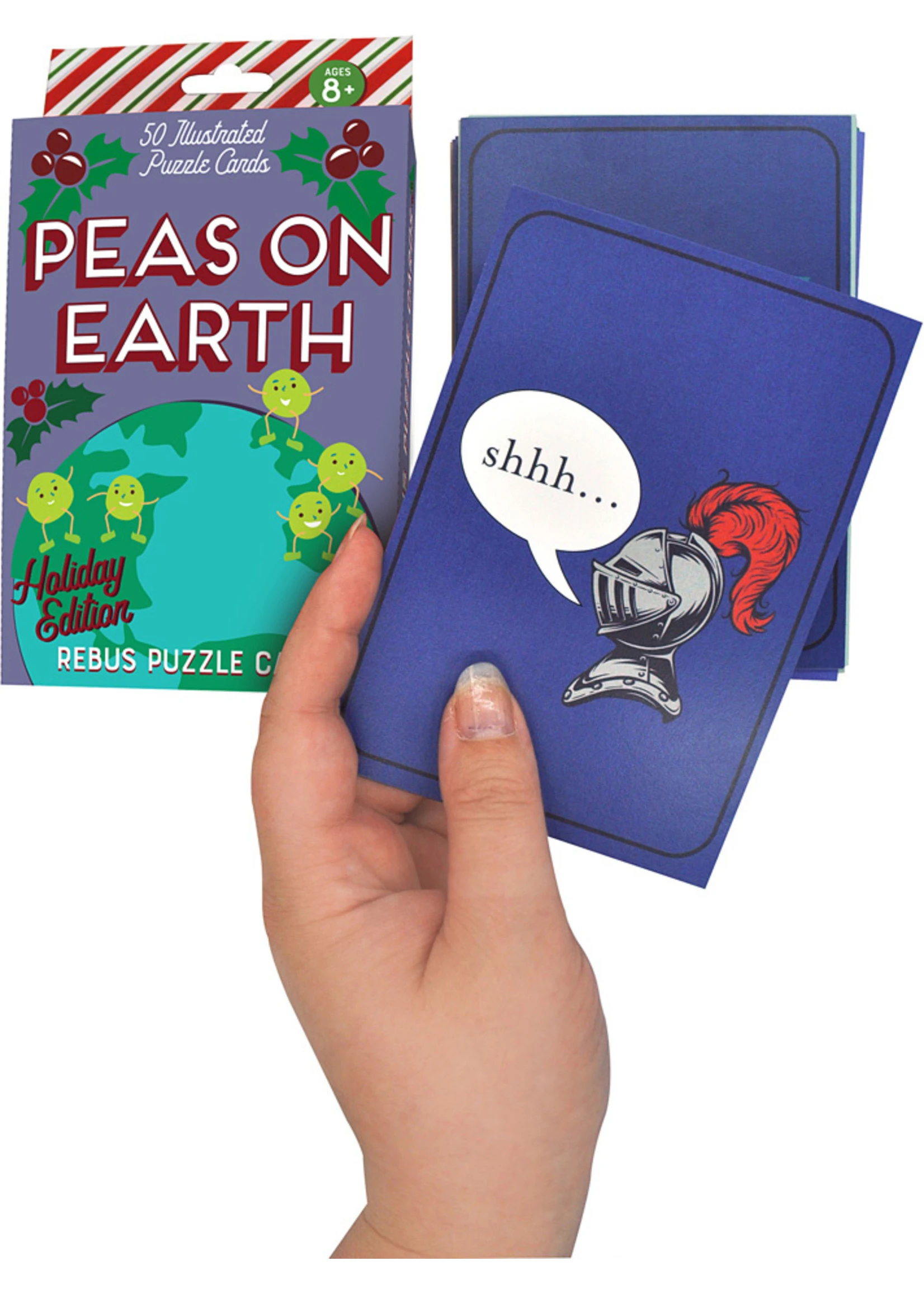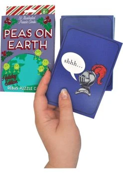 Are those little green veggies dancing on the globe? When fun illustrations convey holiday sayings, that’s a rebus. Here are 20 cards to instantly liven up your holiday gatherings! Each card shows a picture clue to a well known holiday phrase or song on one side, with the answer on the other. Can you solve it?