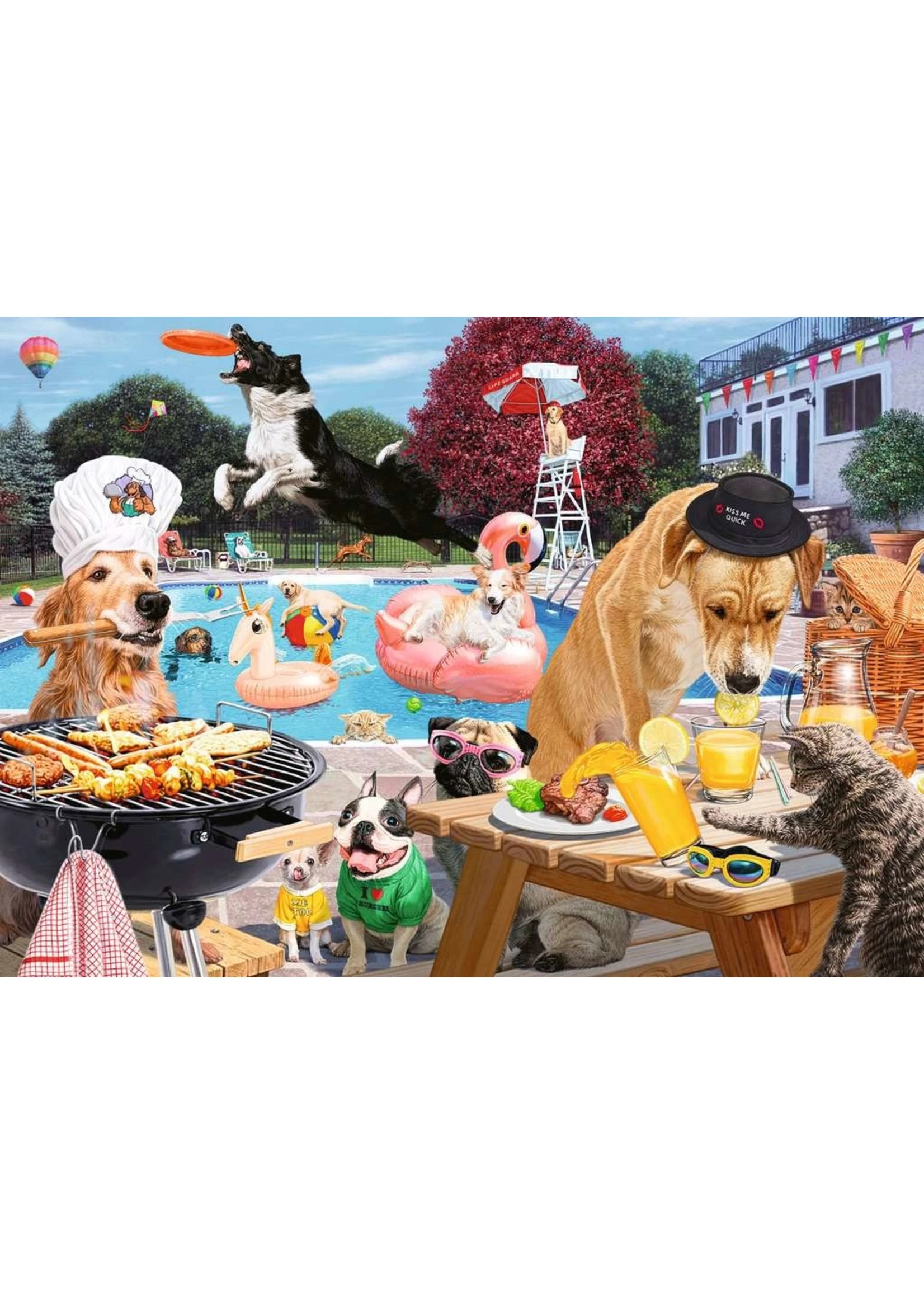 The temperature’s rising but this crew knows how to keep cool! Chef Goldy gets the grill cooking while the Chihuahua, bulldog and pug patiently wait their turn for some tasty treats. The lab laps up some cool lemonade, but it’s obviously not to the tiger cat’s taste. The trusty life-doggy ensures the fun doesn’t get too out of hand and keeps an eye on the furry friends cooling off in the pool. They can’t help but gape at the border collie’s colossal frisbee catch — now that’s one hot dog!