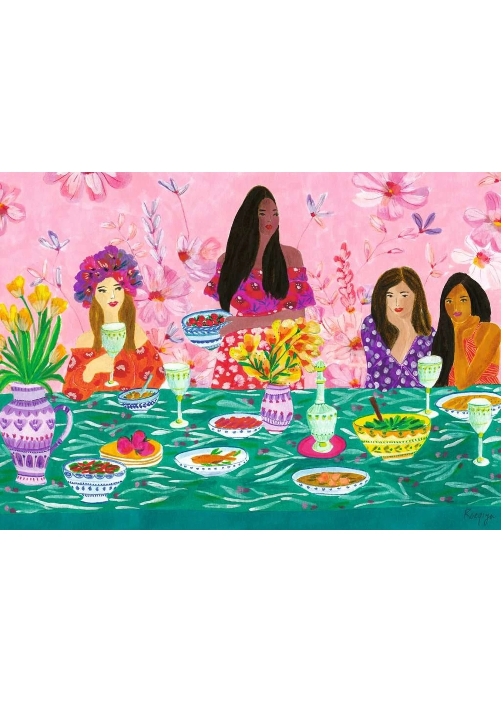 Celebrate unfettered friendship in our brilliant illustration, saturated with floral patterns and vibrant color! Natural nurturers, women are good at taking care of others, and many maintain bonds that deeply enrich their lives. Preparing food for female friends and enjoying a meal together expresses a depth of caring that is often difficult to put into words, but soothes the soul and revives the spirit. Whether spending time with friends or just thinking of them, enjoy a puzzle moment today!