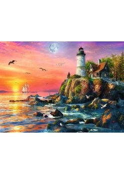 The day is done as the golden sun sinks into the west, reflecting its vibrant orange, pink and purple warmth into a calm sea. A tall ship sails out of harbor to voyage to distant shores, while overhead, seagulls soar. The lighthouse keeper has just left her charming stone cottage to climb the stairs to light the lamp. Even with the shadowy moon, her light is all that keeps ships from running aground on this craggy coast. A perfect puzzle for seafarers and landlubbers alike!