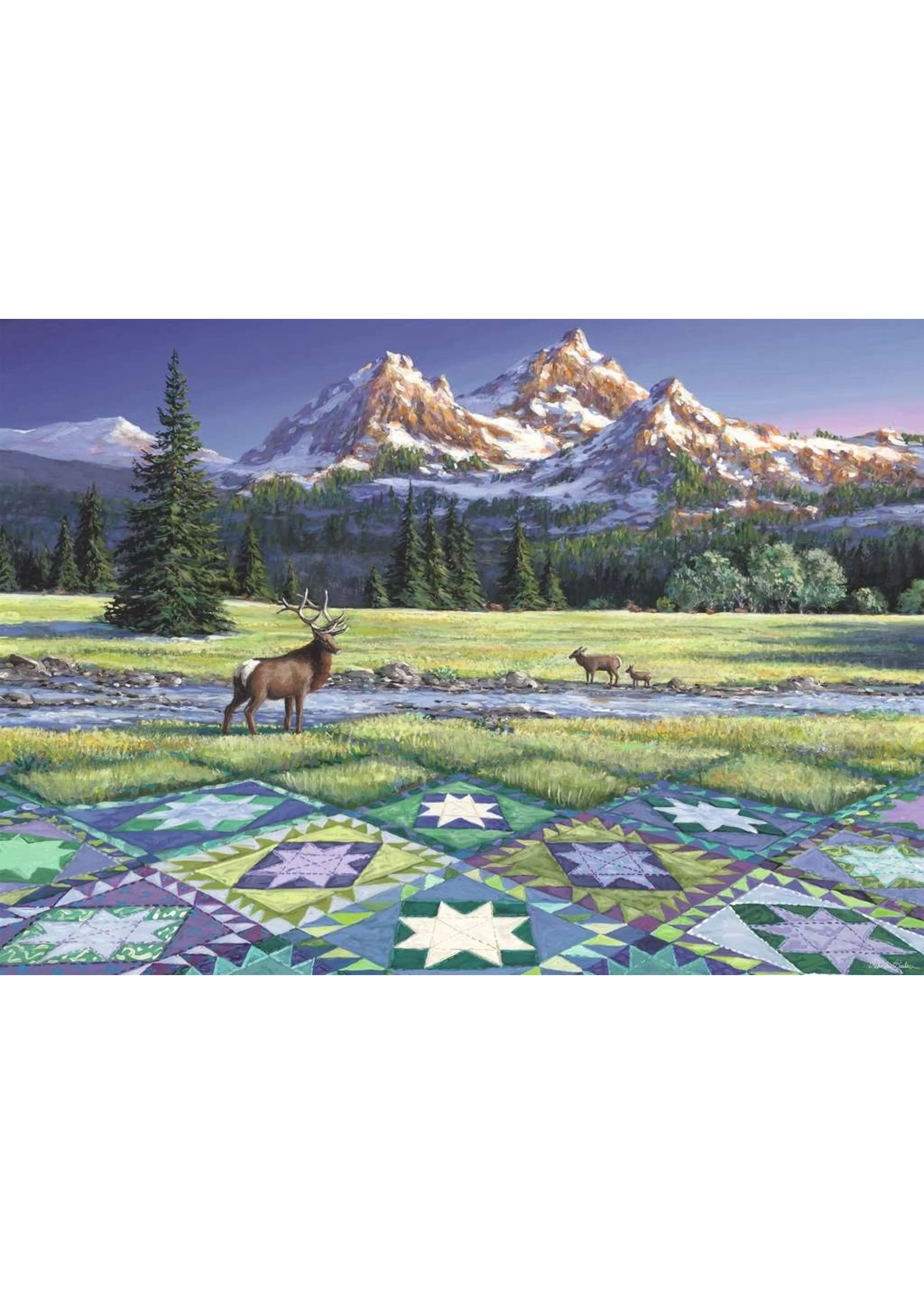 Possibly the only thing that may make a majestic mountain range even more breathtaking is the addition of a quintessential quilt pattern set in the foreground. With the bull elk securing the way for his family to cross the babbling brook, the quilt’s eight-point star pattern invites them to more pristine pastures. A perfect puzzle for any quilter, hiker or nature lover!