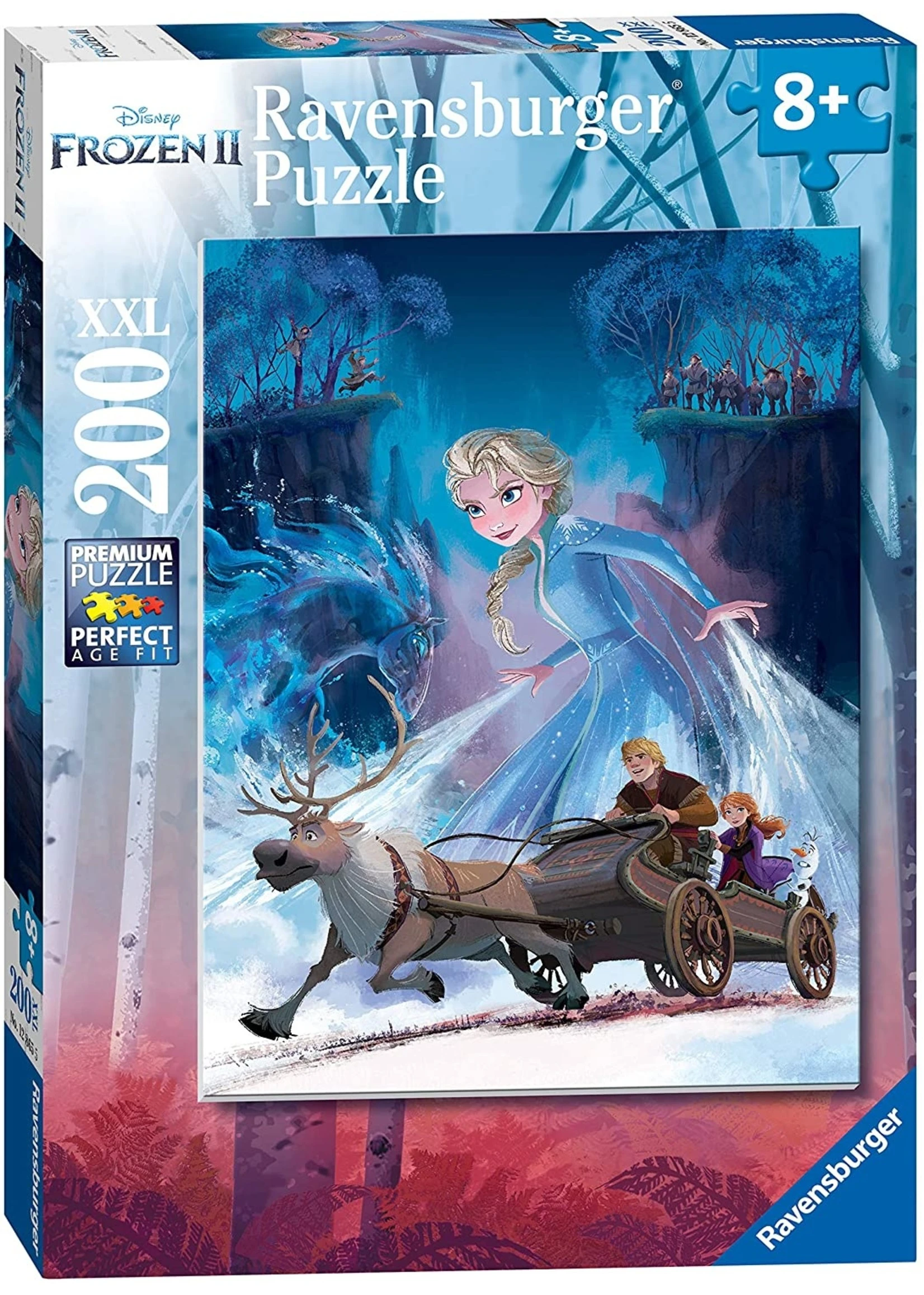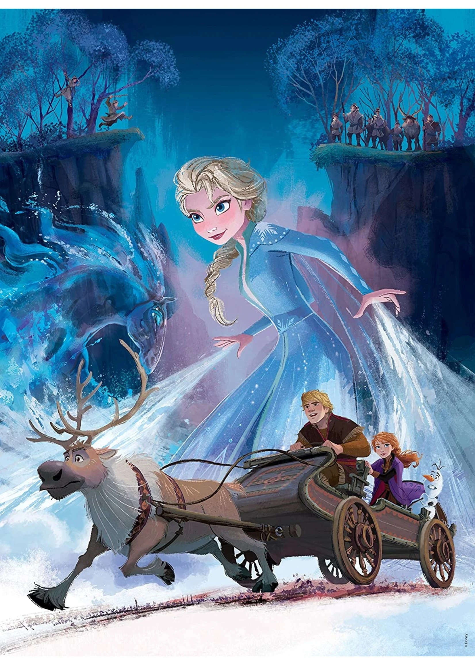 Piece together this 200 piece puzzle, featuring a powerful Elsa using her magic as Sven, Kristoff, Anna and Olaf ride away in their carriage.